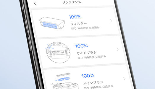 アプリでお知らせ。アプリの画面から、エアーフィルター、サイドブラシ、