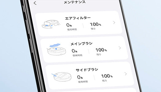 アプリでお知らせ。アプリの画面から、エアフィルター、サイドブラシ、