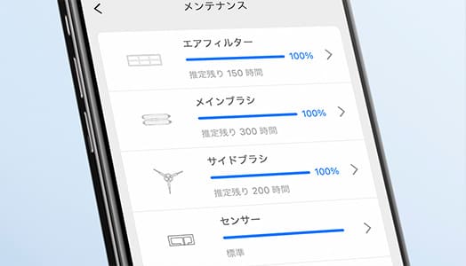 アプリでお知らせ。アプリの画面から、エアフィルター、サイドブラシ、