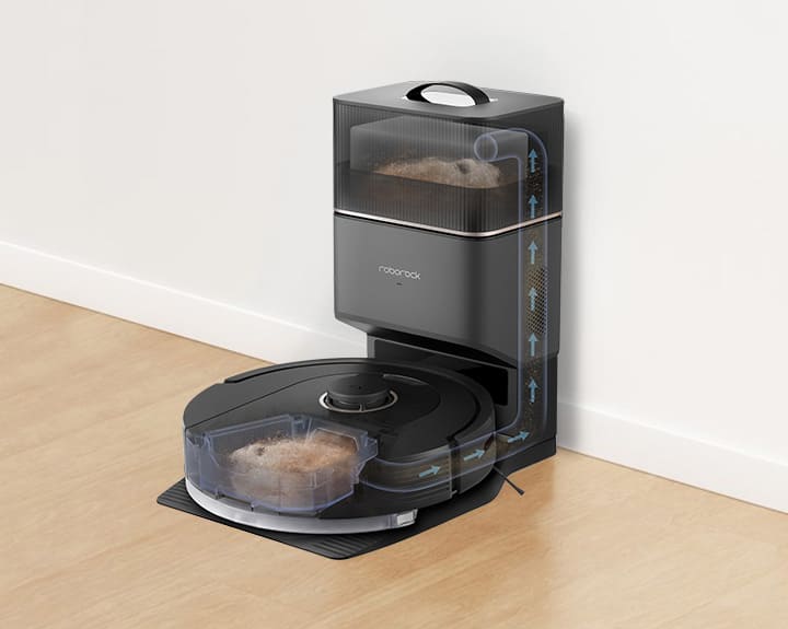 掃除完了後、本体のダストボックスに溜まったゴミを自動で吸い上げ、ゴミを捨てる手間を減らします。