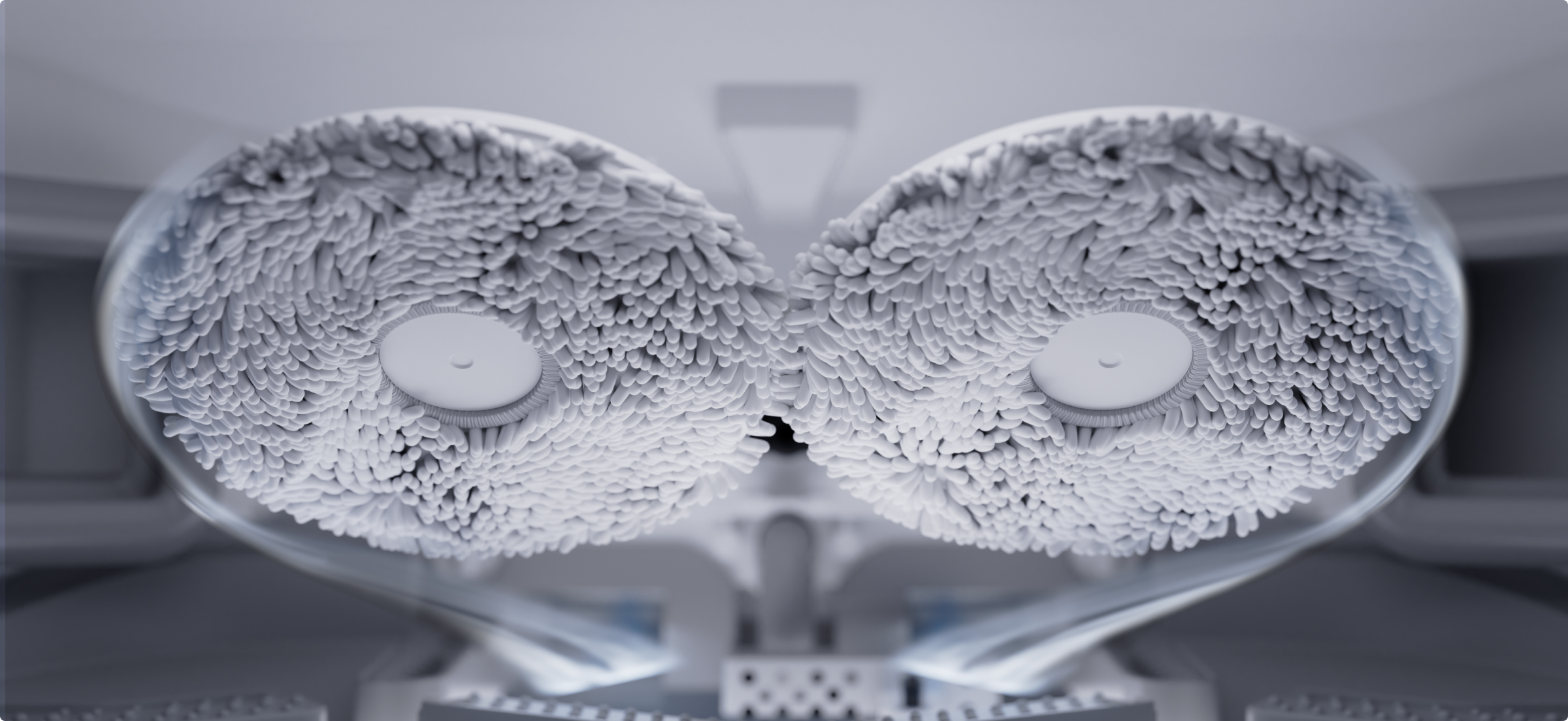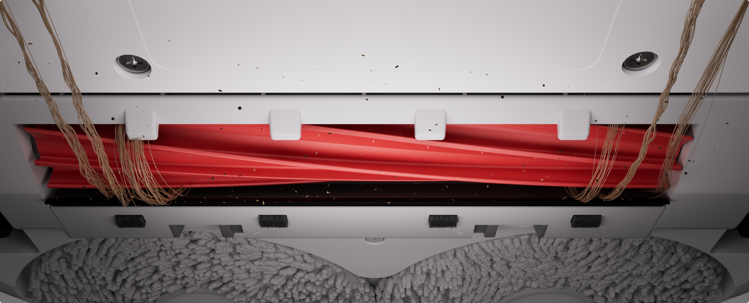 弧状デザインの非対称サイドブラシを採用。遠心力を利用したしなやかな動作によって、長い髪の毛やペットの毛をからめることなく、ゴミをかき集めます。