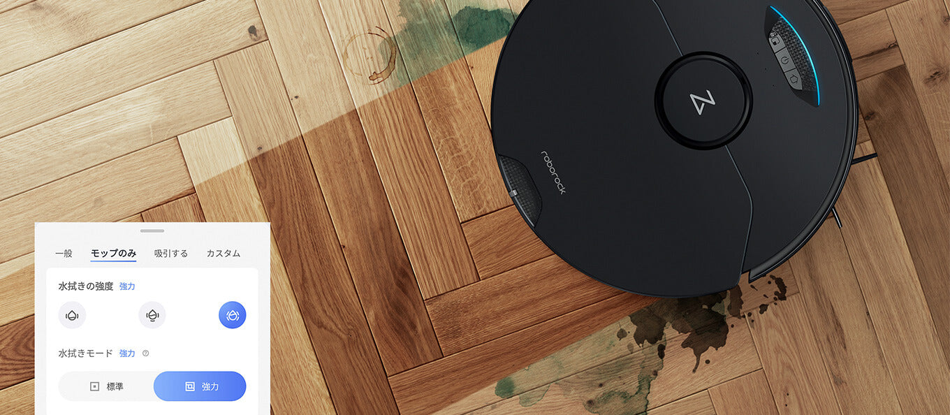 吸引掃除を停止し、水拭きだけを念入りに行う「水拭き強力モード」を搭載。水拭きモップを高速振動させながら、よりきめ細かなルートを走行し、床のべたつきなどもさっぱりと拭き上げます。