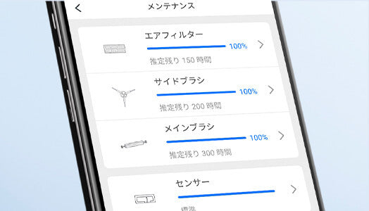 アプリでお知らせ。アプリの画面から、エアーフィルター、サイドブラシ、
