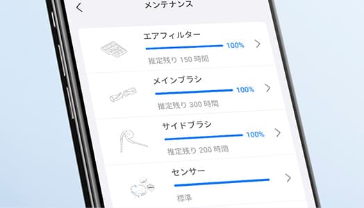 アプリでお知らせ。アプリの画面から、エアフィルター、サイドブラシ、